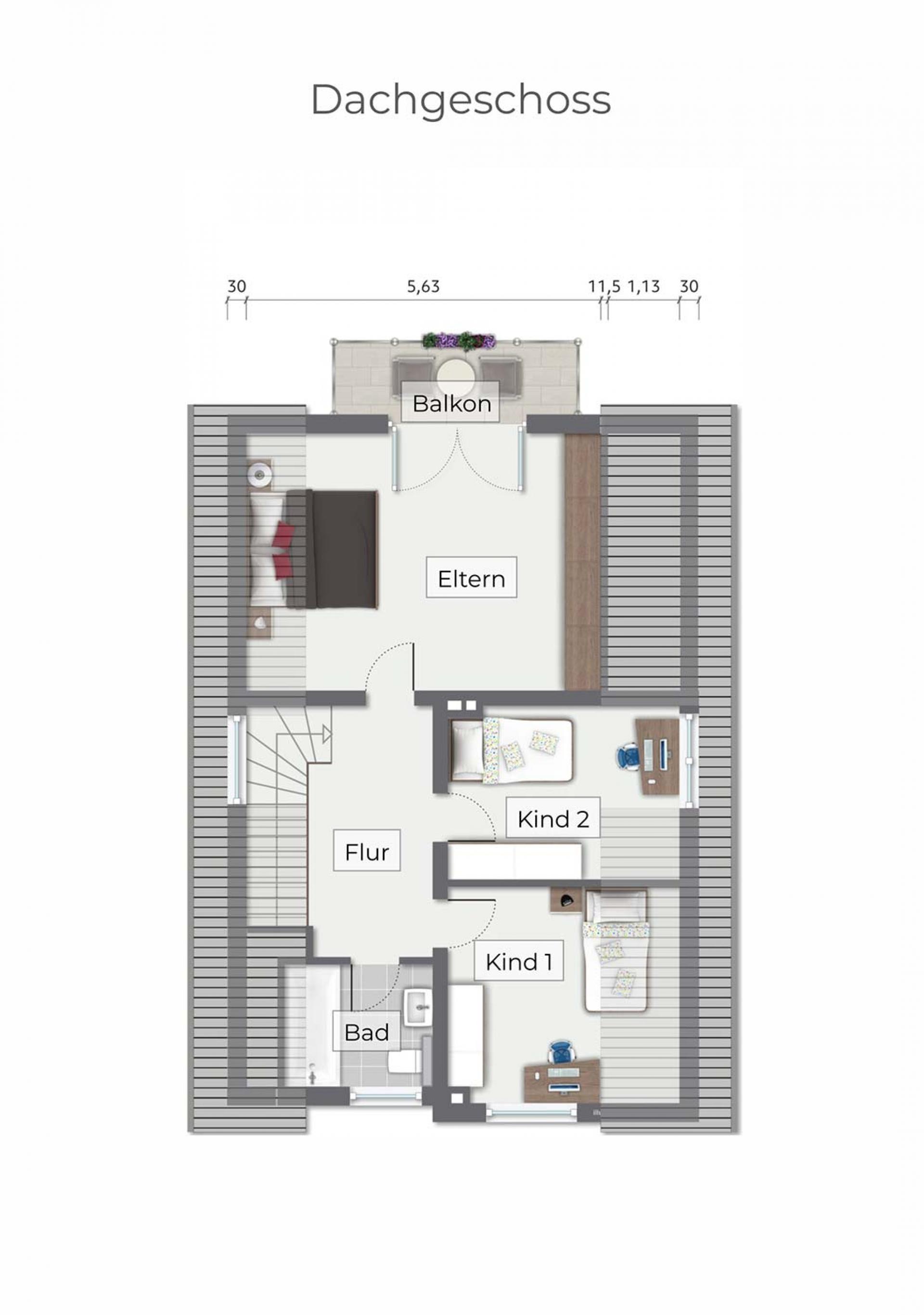 Im Dachgeschoss erwarten Sie ein großes Elternschlafzimmer mit Balkon und zwei Kinderzimmer. Das hell und freundliche Tageslichtbad ist mit einem Fenster und mit einer Badewanne ausgestattet.