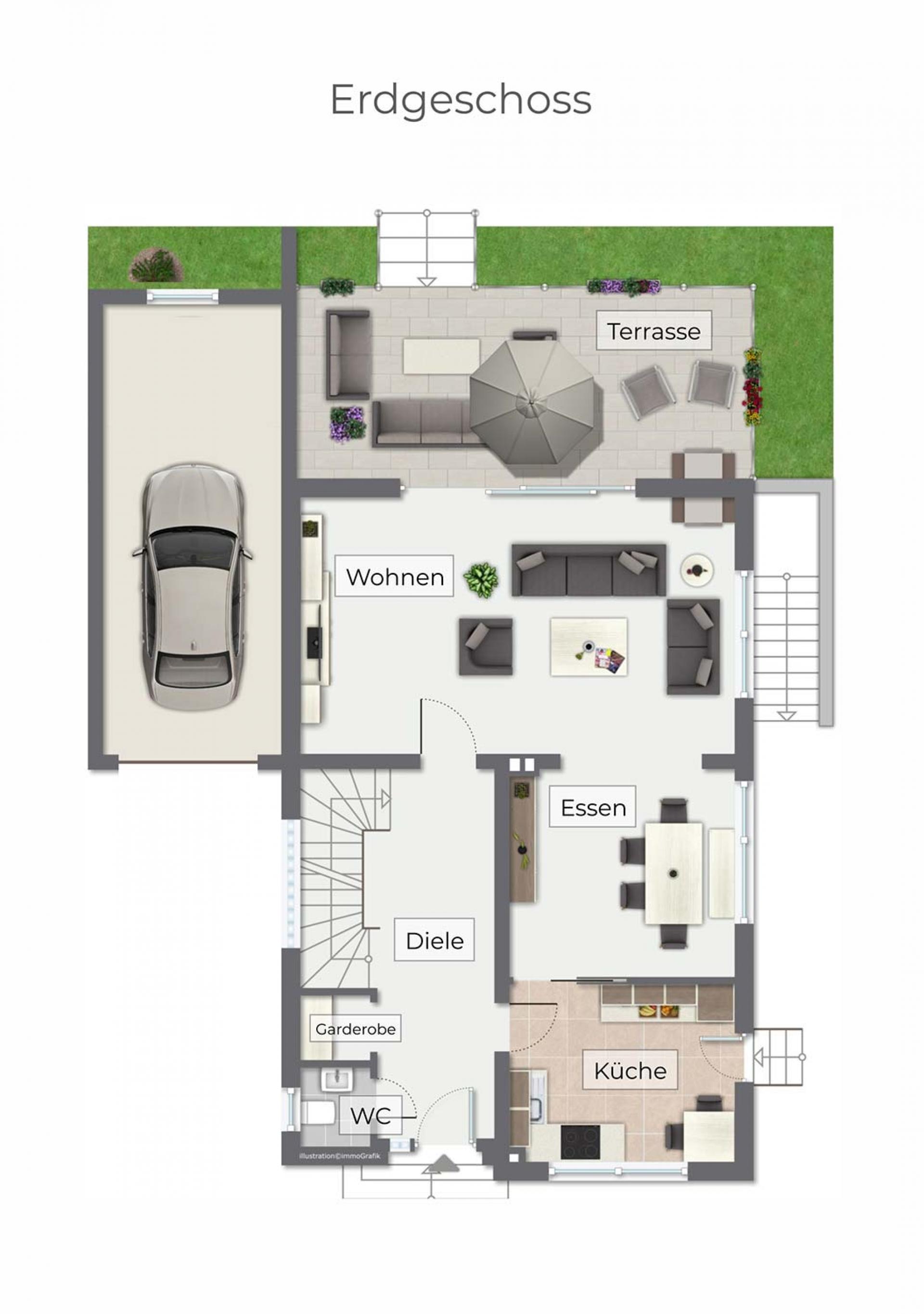 Als Wohnmittelpunkt erwartet Sie ein über 38 m² großer und offen gestalteter Wohn- und Essbereich in L-Form. Edles Parkett, große bodentiefe Fenster mit Blick in den Garten und ein rustikaler Kamin werden Sie begeistern und sorgen für eine warme, behagliche Atmosphäre. Im Winter, eingehüllt in eine flauschige Decke, mit einem spannenden Buch und einer guten Tasse Tee im Lesesessel vor dem flackernden und knisternden Kaminfeuer - hier werden kleine Momente zu großen Augenblicken des Glücks. Die Küche mit Platz für eine Essecke, eine geräumige Diele mit Graderobennische und ein WC komplettieren das Erdgeschoss.